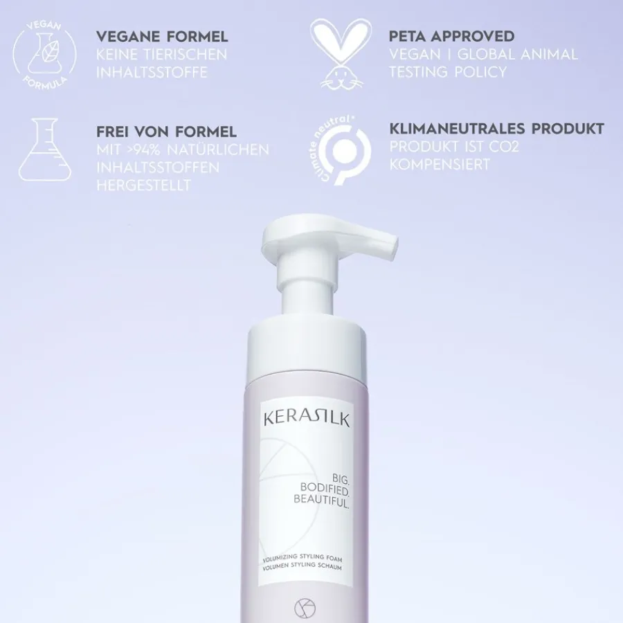 Gebruik Kerasilk Volume Styling Foam voor dagelijks gebruik met langdurige fixatie en een natuurlijke, handelbare look tot 72 uur lang! Het biedt ook betrouwbare bescherming tegen vochtigheid en kroes voor gemakkelijke, niet plakkerige styling. De volume styling foam heeft ook hittebescherming voor het haar op warme zomerdagen. De Kerasilk foam is vooral geschikt voor dun, plat en slap haar. Geef je kapsel een volumineuze en dynamische look met de veganistische formule van de styling foam: 92,5% van de ingrediënten is van natuurlijke oorsprong en 97,2% is biologisch afbreekbaar. De volume styling foam is natuurlijk vrij van microplastics, siliconen, kleurstoffen, sulfaten en minerale oliën.