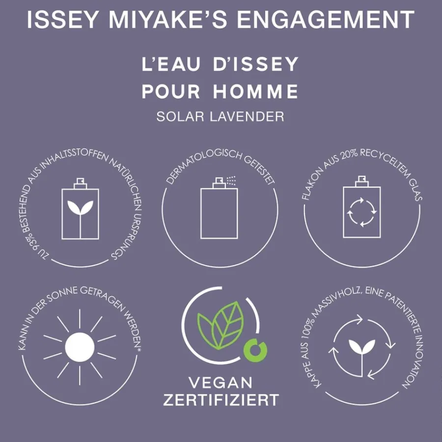Een compositie die de ontmoeting tussen water en materie viert, wordt gepresenteerd in L’Eau d’Issey pour Homme Solar Lavender van Issey Miyake. Deze geur interpreteert de klassieke frisheid van de lijn op een nieuwe, warme en heldere manier. Centraal staat de aromatische kracht van lavendel, die een speciale diepte krijgt door kruidige en houtachtige noten. De creatie ontvouwt een heldere maar intense aanwezigheid die doet denken aan de energie van de zon. De Eau de Toilette Intense combineert aquatische noten met de warmte van kruiden om een expressieve geurbeleving te creëren. De flacon weerspiegelt deze combinatie: het minimalistische design met strakke lijnen wordt aangevuld met een donkere houtlook dop en een subtiele lavendelkleurige glinstering op de basis, die de puristische esthetiek van het merk onderstreept.