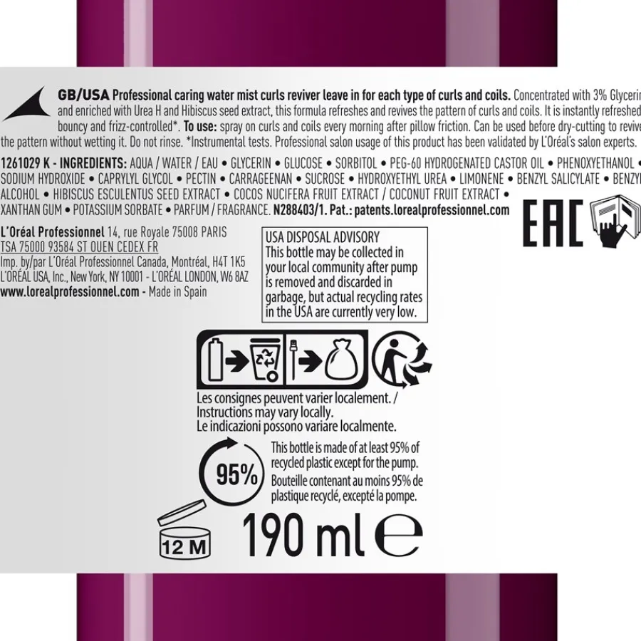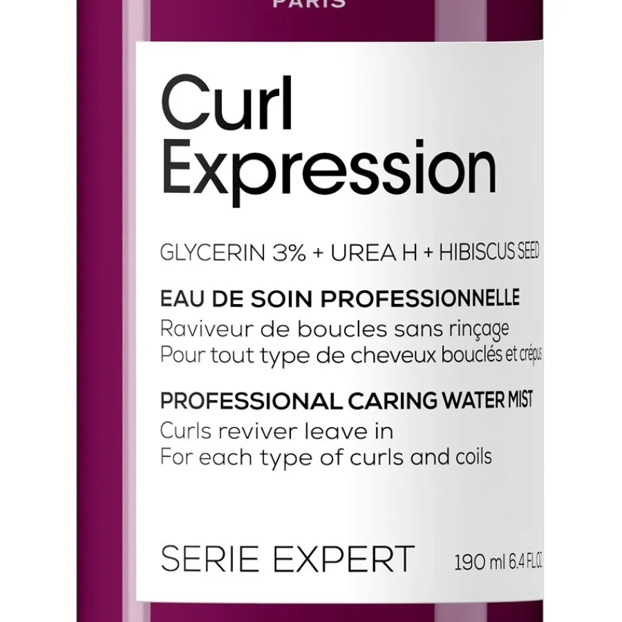 De verzorgende waternevel uit de Expert Curl Expression lijn is verrijkt met hibiscuszaadextract, urea H en glycerine (3%). Deze formule verfrist krullen en laat ze er gezonder uitzien. L’Oréal Professionnel Paris belooft dat dit product geschikt is voor alle soorten krullend haar.