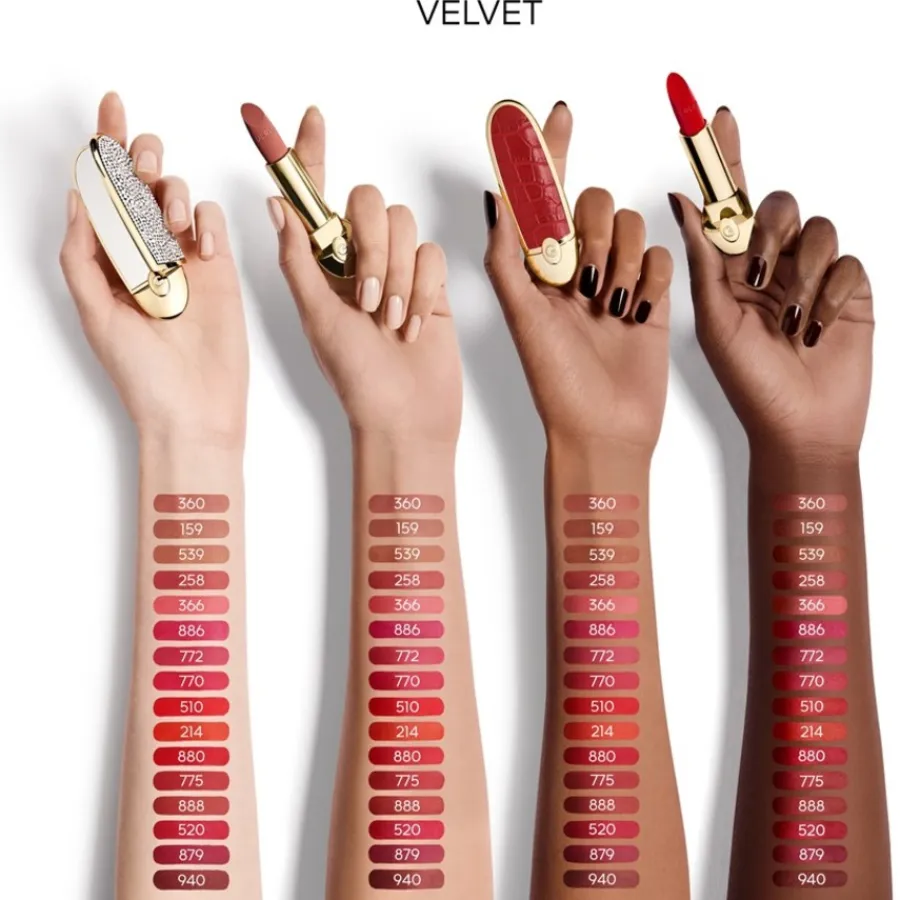 De Rouge G Velvet van Guerlain is een lipstick met een fluweelzachte, matte finish. De ultralichte, omhullende textuur zorgt voor een comfortabel gevoel dat tot 16 uur kan blijven zitten. De formule legt zacht op de lippen en kan ze optisch gladstrijken. Een exclusief kleurenpalet biedt een selectie intense tinten die geschikt zijn voor verschillende huidtinten. De hoge pigmentatie wordt versterkt door de toevoeging van Abessijnse olie, die de kleuren een speciale levendigheid geeft. Dit product wordt aangeboden als navulling en kan worden gecombineerd met de apart verkrijgbare Rouge G Cases om een gepersonaliseerd accessoire te creëren.