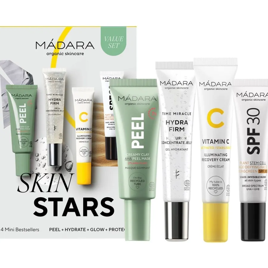 De Hydra Firm Gel is olievrij, trekt snel in en hydrateert diep dankzij het geconcentreerde hyaluronzuur. En met berkenwater voorziet het de huid ook van antioxidanten en aminozuren. Dit huidverzorgingsproduct is ideaal voor de rijpere en droge huid of de huid die gevoelig is voor problemen. Plantaardige stamcellen van de Noordse drakenkop voorzien de Plant Stern Cell Age-Defying Sun Cream SPF 30 van antioxidanten. Ze beschermen tegen luchtvervuiling, helpen de huid te regenereren en brengen de huidflora in balans. De zacht getinte crème is ook een prachtige dagcrème. Als je op zoek bent naar een verhelderende huidverzorging, bevat de MÁDARA Light geschenkset de Vitamin C Illuminating Recovery Cream, die verrijkt is met hyaluronzuur en zeewier.