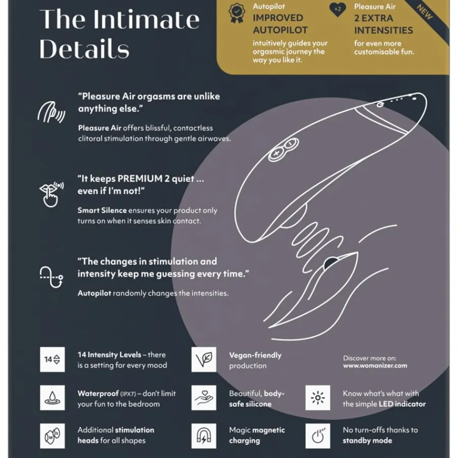 Gewoon achterover leunen en je laten verrassen? Met Womanizer PREMIUM 2 wordt me-time sensueel en ontspannen! De verbeterde automatische piloot begeleidt je genot en verrast je met 14 intensiteitsniveaus – afhankelijk van je stemming. Het belangrijkste kenmerk van dit speeltje is ook de gepatenteerde Pleasure Air Technologie, die de clitoris volledig contactloos masseert met zachte luchttrillingen. Het resultaat: ongekende orgasmes. De Smart Silence-functie zorgt voor een bijzonder discrete time-out. Dit betekent dat de PREMIUM 2 alleen start als hij in contact komt met de huid. Als je het speeltje weghaalt, valt het stil. Dankzij de LED communicatie is het bedienen van de clitorisstimulator makkelijker dan ooit, omdat het laat zien in welke modus je bent en wat het batterijniveau is,