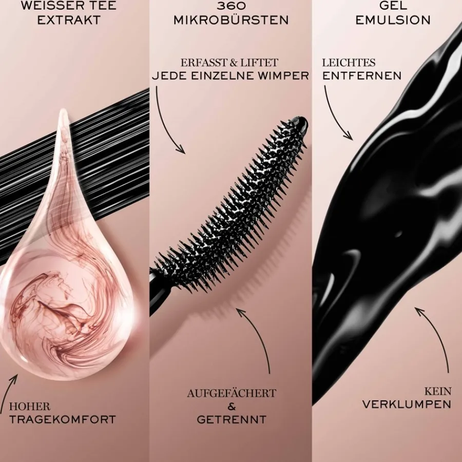 De Lash Idôle mascara van Lancôme hult de wimpers in een intens zwarte kleur en geeft de blik expressiviteit. De textuur is gebaseerd op een gelemulsie met vier keer minder was voor een vederlicht gevoel zonder klonters. De formule is ook verrijkt met witte thee-extract. Een bijzonder kenmerk is het ergonomisch gebogen borsteltje, dat is voorzien van 250 verschillende haarlengten en 350 micro-haartjes. Dit zorgt ervoor dat elke wimper van wortel tot punt wordt opgevangen en gedefinieerd. Voor een optimaal resultaat wordt de mascara aangebracht met lichte zigzagbewegingen. Afhankelijk van de gewenste intensiteit kunnen meerdere laagjes worden aangebracht. De waterproof en veegbestendige formule laat een comfortabel gevoel achter, zonder af te brokkelen of te vlekken.