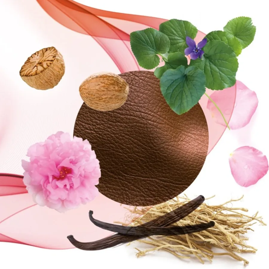 leer, opoponax, roos, vetiver