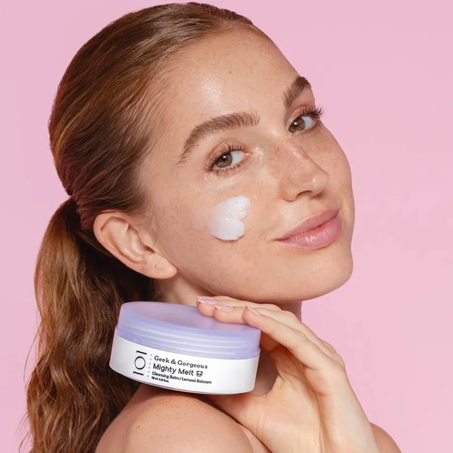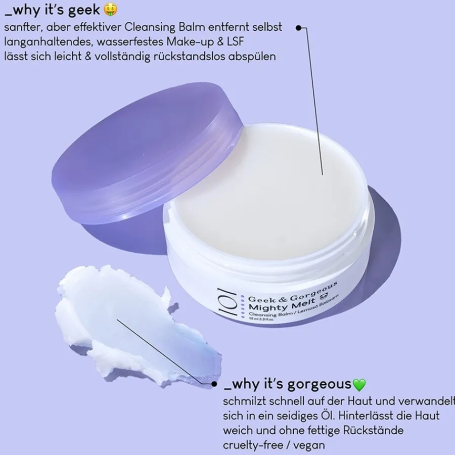 De Mighty Melt Reinigingsbalsem uit de 101 Basics categorie van Geek & Gorgeous reinigt de huid op milde wijze en verwijdert vuil, make-up en zonbeschermingsproducten zonder resten achter te laten. Het kan gebruikt worden op alle huidtypes, inclusief de gevoelige huid. De formule is vrij van dierproeven, gluten, geurstoffen en essentiële oliën. Bij contact met water verandert de huidverzorging in een zijdezachte, melkachtige olie. Deze glijdt zachtjes over de huid, smelt in de huid en maakt haar porie-diep schoon. Breng de balsem met ronddraaiende bewegingen aan op de droge huid, voeg water toe en was je gezicht vervolgens grondig. Geniet van een fluweelzachte, vlekkeloos mooie en verzorgde huid!