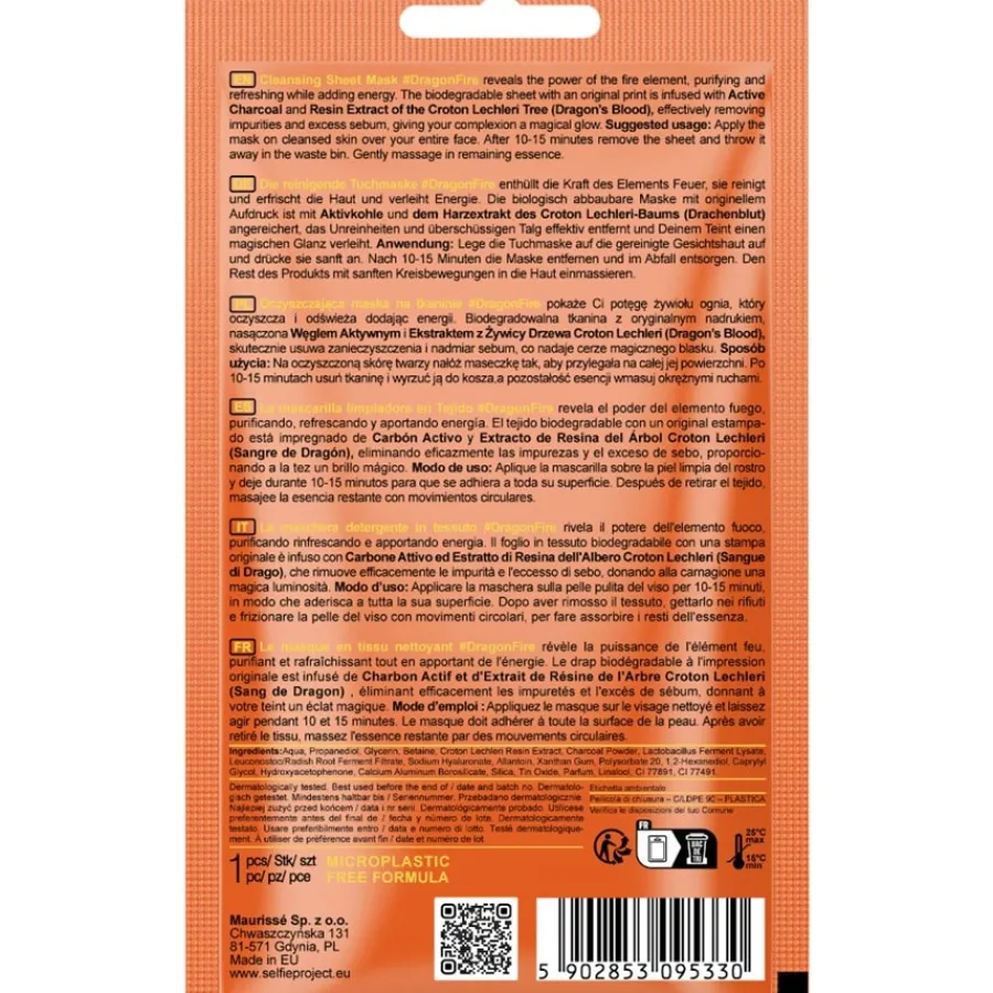 Het Selfie Project Fantasy Cleansing Sheet Mask #DragonFire staat voor de kracht van vuur en zorgt voor een diepe reiniging van de poriën en nieuwe energie. De sheetmaskers van de fabrikant zijn gemaakt van zacht, biologisch afbreekbaar materiaal, passen zich perfect aan de contouren van het gezicht aan en zijn comfortabel om te dragen. Bovendien zorgt de optimale pasvorm ervoor dat de actieve ingrediënten een nog intensievere werking hebben. Het huidverzorgingsmasker is doordrenkt met een essence van geactiveerde houtskool en hars extract van de croton lechleri boom, ook wel bekend als drakenbloed. Deze actieve ingrediënten verwijderen effectief overtollig talg en onzuiverheden van de huid en zorgen voor een frisse huid met nieuwe energie en een magische gloed.