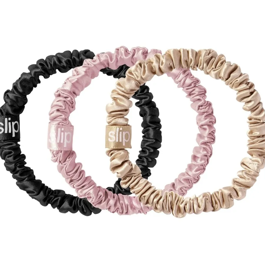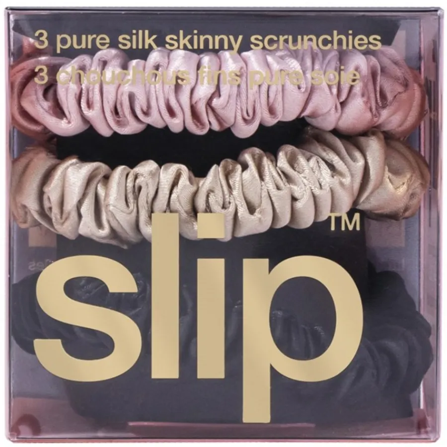 De Skinny Hair Scrunchies van slip Hair Care worden gepresenteerd als een set van zes smalle scrunchies. Ze zijn gemaakt van Slipsilk™, een stof van pure zijde die ook wordt gebruikt in de kussenslopen van het merk. Elke scrunchie bestaat uit een elastische band die volledig bedekt is met dit zijdeachtige materiaal. Het bijzonder gladde oppervlak van de zijde glijdt over het haar en kan zo sterk trekken of wrijving verminderen. Verkrijgbaar in verschillende kleurencombinaties, zoals zwart, beige en rosé, vullen de scrunchies verschillende stijlen aan.