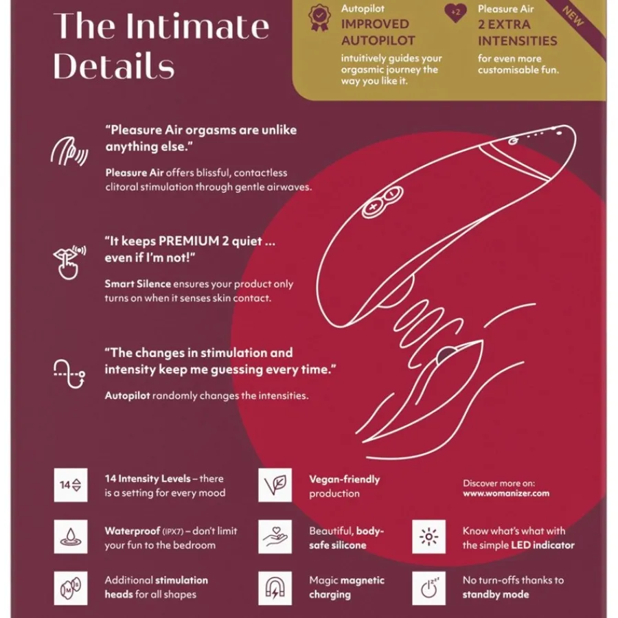 Gewoon achterover leunen en je laten verrassen? Met Womanizer PREMIUM 2 wordt me-time sensueel en ontspannen! De verbeterde automatische piloot begeleidt je genot en verrast je met 14 intensiteitsniveaus – afhankelijk van je stemming. Het belangrijkste kenmerk van dit speeltje is ook de gepatenteerde Pleasure Air Technologie, die de clitoris volledig contactloos masseert met zachte luchttrillingen. Het resultaat: ongekende orgasmes. De Smart Silence-functie zorgt voor een bijzonder discrete time-out. Dit betekent dat de PREMIUM 2 alleen start als hij in contact komt met de huid. Als je het speeltje weghaalt, valt het stil. Dankzij de LED communicatie is het bedienen van de clitorisstimulator makkelijker dan ooit, omdat het laat zien in welke modus je bent en wat het batterijniveau is,