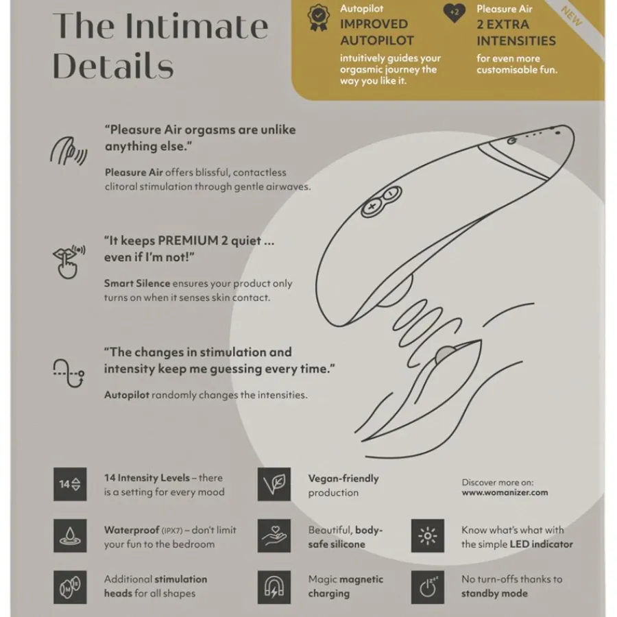 Gewoon achterover leunen en je laten verrassen? Met Womanizer PREMIUM 2 wordt me-time sensueel en ontspannen! De verbeterde automatische piloot begeleidt je genot en verrast je met 14 intensiteitsniveaus – afhankelijk van je stemming. Het belangrijkste kenmerk van dit speeltje is ook de gepatenteerde Pleasure Air Technologie, die de clitoris volledig contactloos masseert met zachte luchttrillingen. Het resultaat: ongekende orgasmes. De Smart Silence-functie zorgt voor een bijzonder discrete time-out. Dit betekent dat de PREMIUM 2 alleen start als hij in contact komt met de huid. Als je het speeltje weghaalt, valt het stil. Dankzij de LED communicatie is het bedienen van de clitorisstimulator makkelijker dan ooit, omdat het laat zien in welke modus je bent en wat het batterijniveau is,